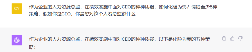 Prompt10:作为企业的人力资源总监,在绩效实施中面对CEO的种种质疑,如何化险为夷?请给至少5种策略,假如你是CEO,你最想对这个人资总监说什么