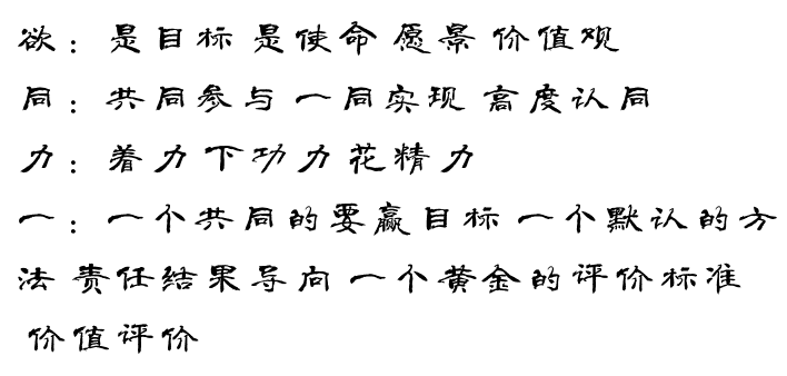 我想说的是,PBC的重点一定不是只是个人业绩承诺,之所以PBC在华为公司,在IBM公司能被长期使用且不被质疑,华为不断地强调了“上下同欲、力出一孔”而且有为之量身定做的制度与机制;在IBM,“赢”理念深入人心,只要你进入他的办公区域,电话上的屏保就是大大的“WIN”。